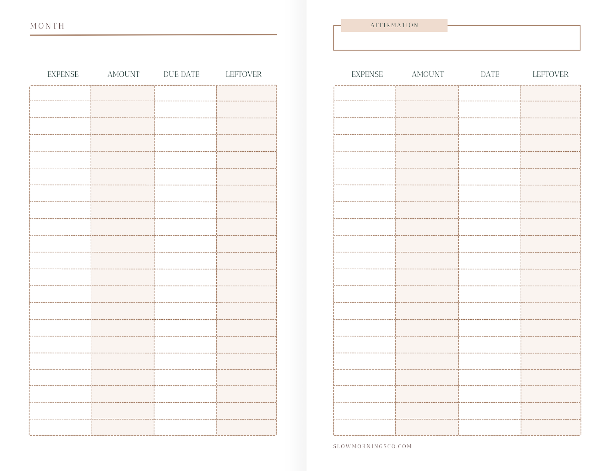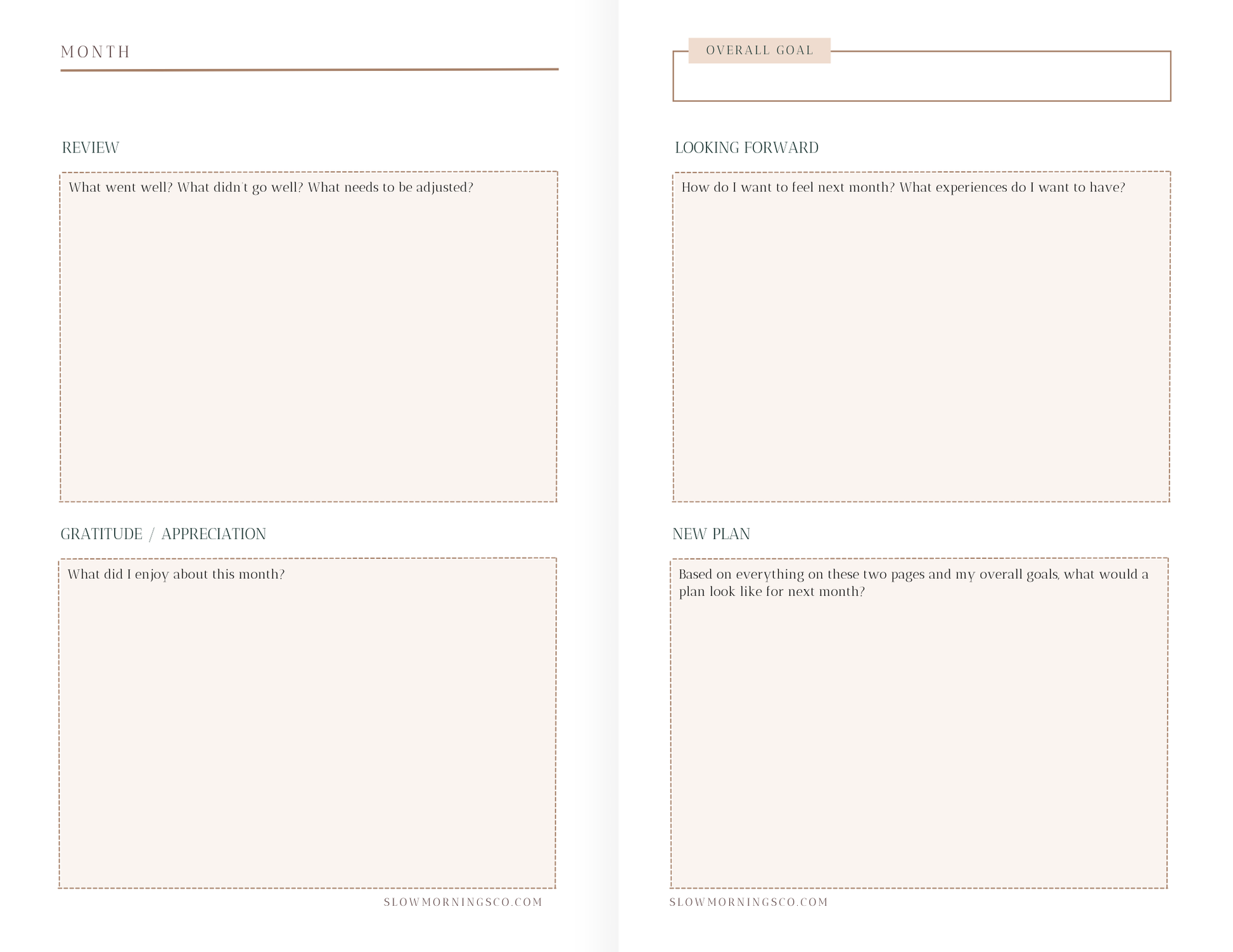 Included in the Undated Planner, is a goal setting section, where you will be walked through from your big picture to smaller actionable steps. With undated monthly calendars, and five weeks of hourly agendas for each month - you'll have it all planned out! At the end of each month, you'll be prompted to reflect, taking a moment to slow down and get intentional again. Then, if you are so inclined, there is an expense tracker. No pressure though. We know you need a little overpriced coffee to get through. We do too.